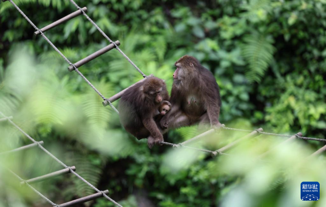 在峨眉山景区自然生态猴区,猴子在吊桥上休憩(6月5日摄)。新华社记者 江宏景 摄