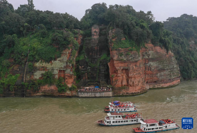 游客乘坐游船参观乐山大佛(2018年10月4日摄,无人机照片)。新华社记者 江宏景 摄