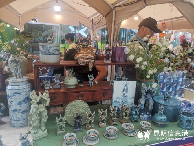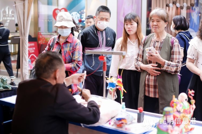 活动现场,非遗集市热闹非凡。循着香甜的味道,一个个生动巧妙的糖画和面塑作品馋坏了路过的小朋友;精巧的瓦猫、斑铜、锔瓷等工艺品吸引群众驻足,感受匠人们精湛的技艺;一旁竹编、草编师傅手指翻飞,栩栩如生的小动物引来了不少市民,纷纷询问其中的文化内涵和技艺手法。此次活动集中展示了来自盘龙区的12个非遗代表性项目及作品,同时来自安宁市文化馆组织的扎染、手工香、铁胆石砚台、刻纸、雕刻5个代表性非遗项目也大放异彩。除了非遗文化之外,在集市还有雄达茶文化城带来的云南有好茶(新派茶饮)主题互动活动,闻茶香、赏茶艺、品茶韵,在阵阵茶香中展现出了传统文化连接现代生活的魅力。