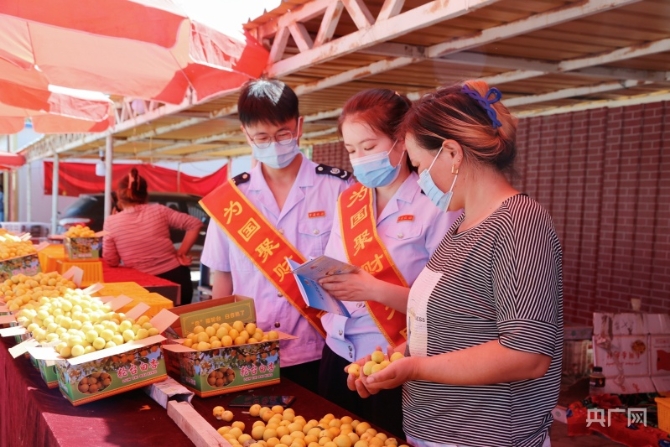 国家税务总局轮台县税务局“小白杏志愿服务队”向小白杏种植户宣传政策(央广网发 崔文文 摄)
