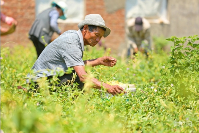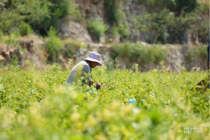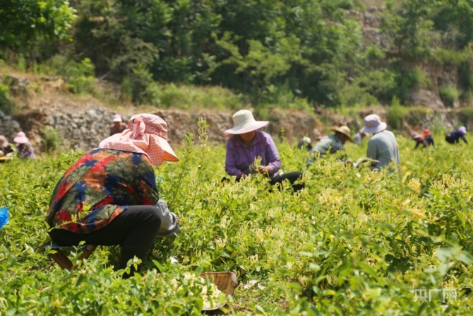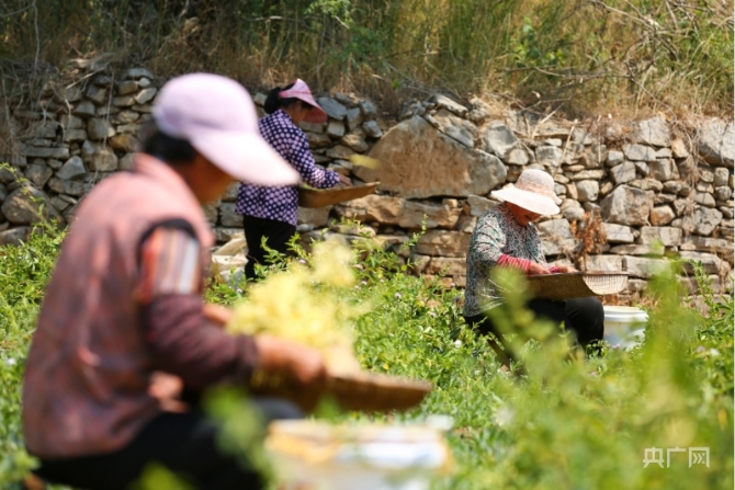 潘家场村村民正在采摘金银花(央广网记者唐磊 摄)