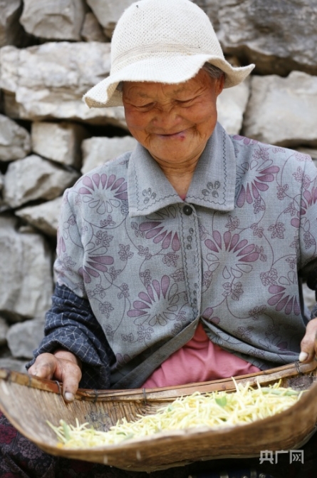82岁的田大娘正在对采摘的金银花进行筛选(央广网记者唐磊 摄)