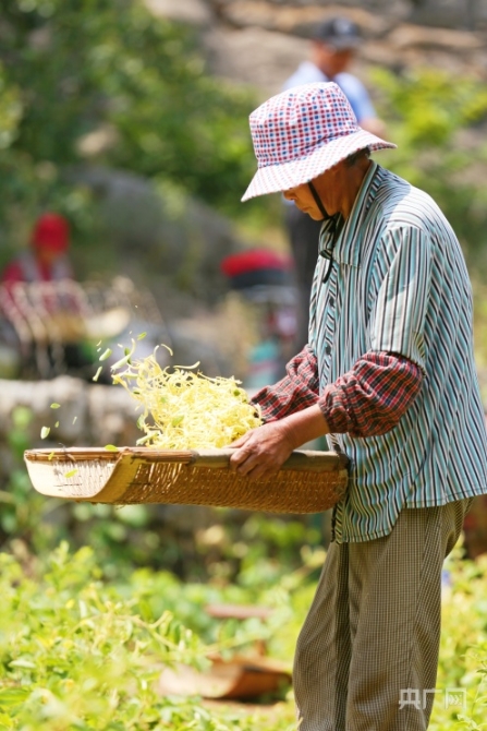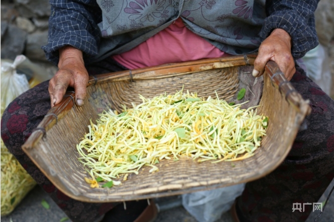 村民正在去掉金银花里的杂质(央广网记者唐磊 摄)
