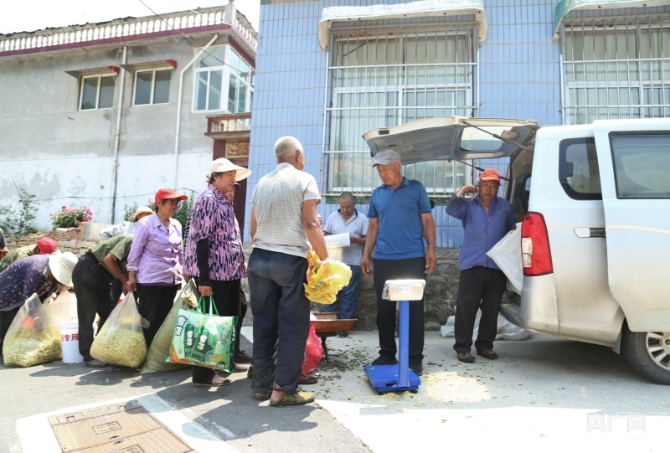 村民们将采摘的金银花进行称重、装车(央广网记者唐磊 摄)