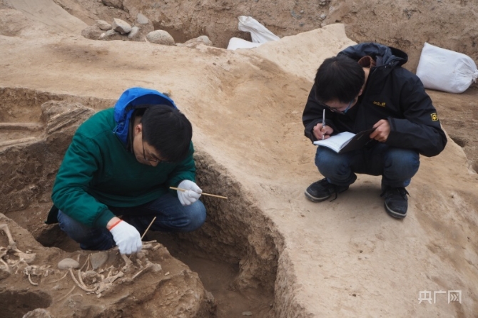 工作人员在喇家遗址对出土动物骨骼进行现场检测(央广网发 青海省文物局供图)