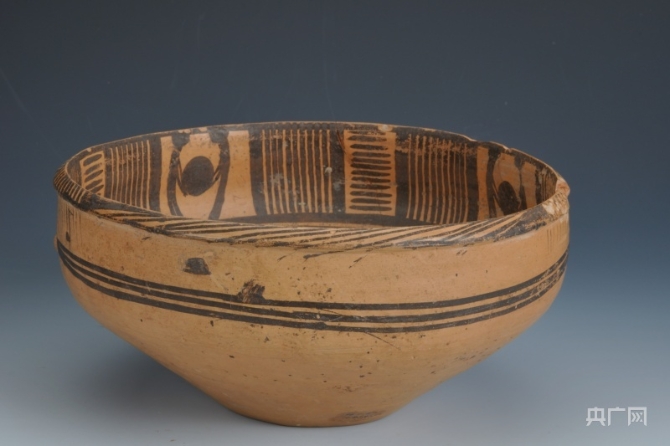 青海省博物馆历史文物展展品:圆点网纹彩陶盆(央广网记者 汪晓青 摄)