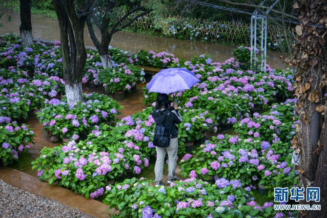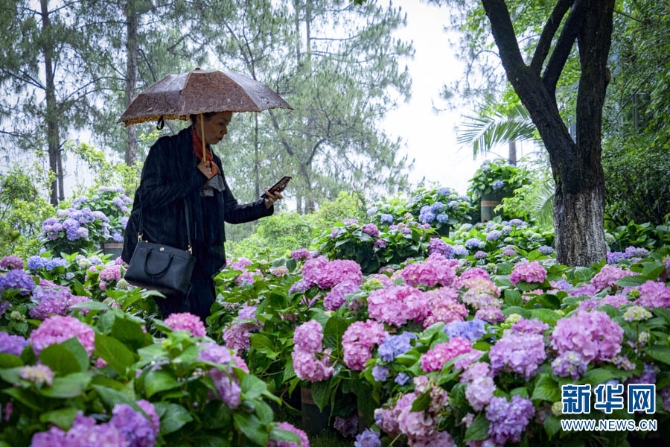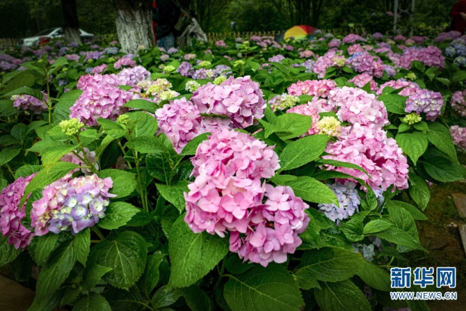 近日,云南昆明郊野公园成了绣球花的主场,吸引了部分游客冒雨前来拍照打卡。新华网发(郑益5月21日摄)