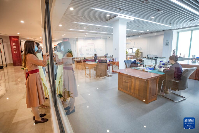 6月9日,在三峡文物科技保护基地,观众在半开放式的文物修复室外观看文物修复过程。新华社记者 黄伟 摄