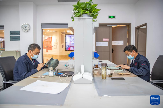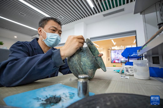 6月9日,在三峡文物科技保护基地,“文物医生”在半开放式的文物修复室内修复青铜器。新华社记者 黄伟 摄