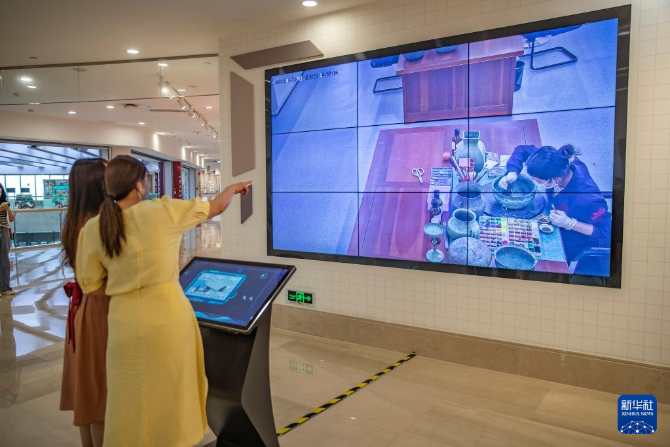6月9日,在三峡文物科技保护基地,观众通过360°高清摄像头观看文物修复过程。新华社记者 黄伟 摄