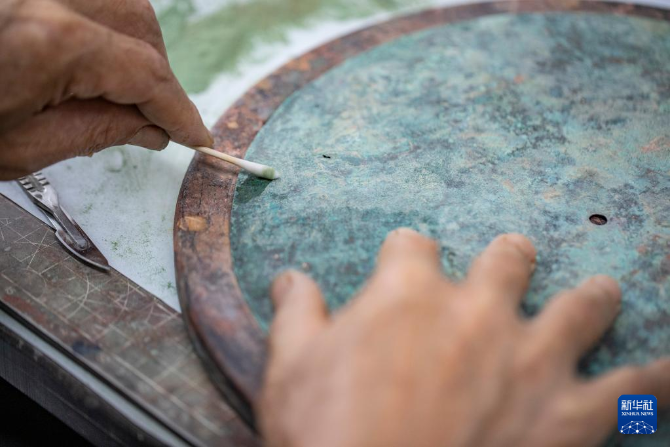 6月9日,在三峡文物科技保护基地,“文物医生”对修补后的青铜器文物进行协色。新华社记者 黄伟 摄