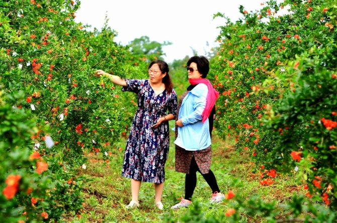 2021年6月,游客在淅川县南水北调中线工程渠首附近的石榴园里观赏石榴花。(淅川县委宣传部供图)