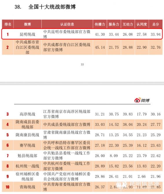 昆明信息港讯 记者周璐 日前,2022年第一季度政务微博影响力报告发布,昆明统战微博上榜“全国十大统战部微博”并位列榜首。