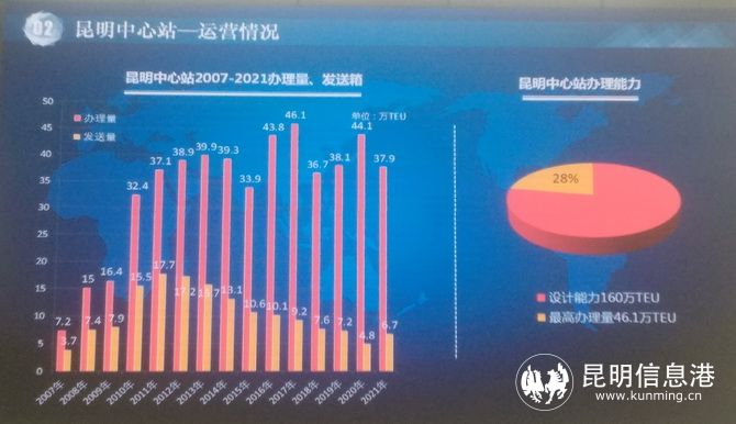 中铁联集昆明中心站位于呈贡王家营,2006年11月4日开通运营,是云南省和云贵高原地区唯一的大型集装箱物流中心。中心站与成昆、沪昆、昆玉铁路紧密衔接,是铁路运力资源最充足、运力调配最高效的车站;中心站还与昆磨、广昆和昆明南绕城高速公路连接,能够便利承接来自云南各方向的货物。中心站占地1239亩,堆场可一次性堆存2万标箱,全场布局11条股道,配备正面吊10台,现代化的仓库2.6万平方米,年办理能力约40万标箱。