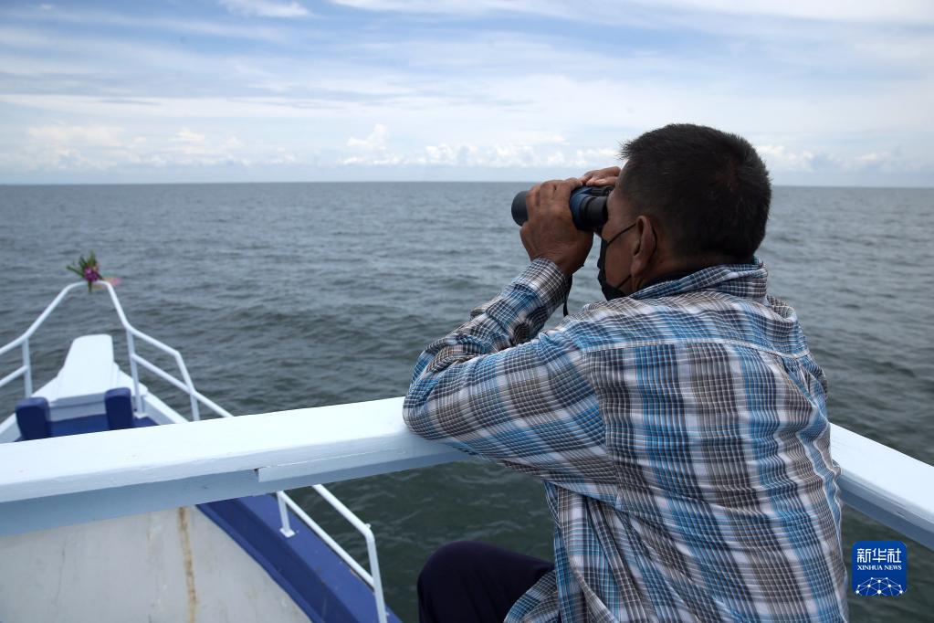 5月11日,一名泰国海洋与海岸资源局工作人员在泰国湾搜寻布氏鲸。新华社 记者王腾/摄