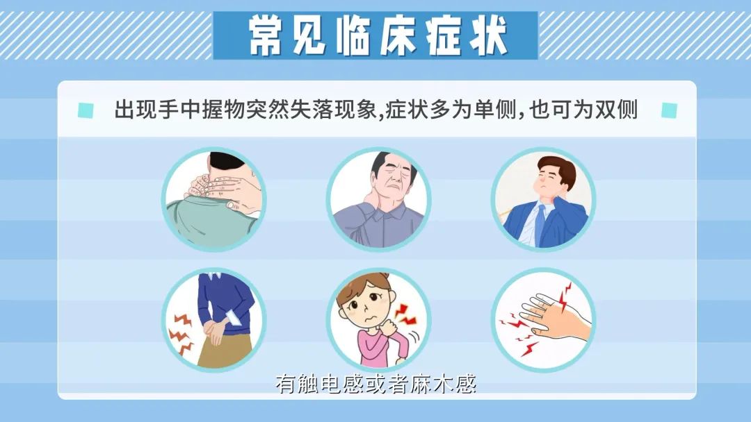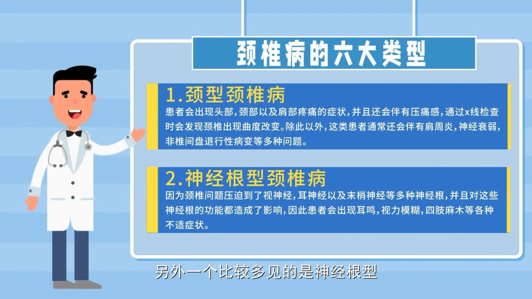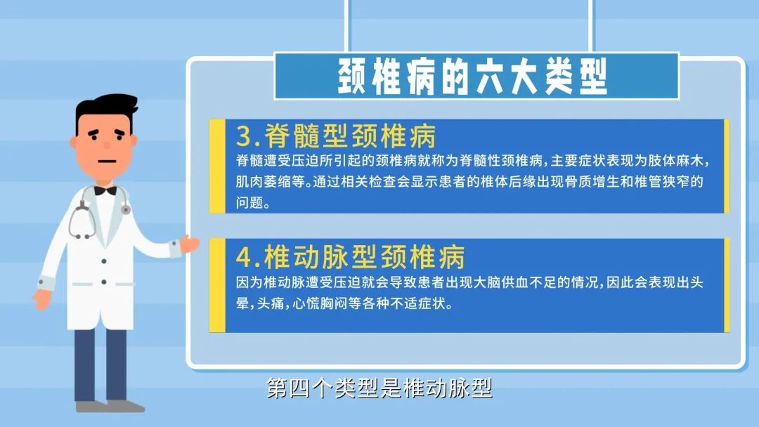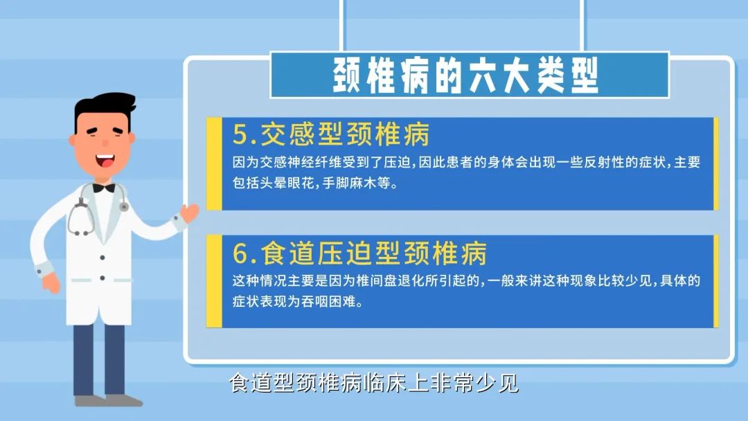 颈椎病临床上一般常见分6个类型:第一是颈型、第二是神经根型、第三是脊髓型、第四是椎动脉型、第五是交感神经型、第六是食道压迫型。