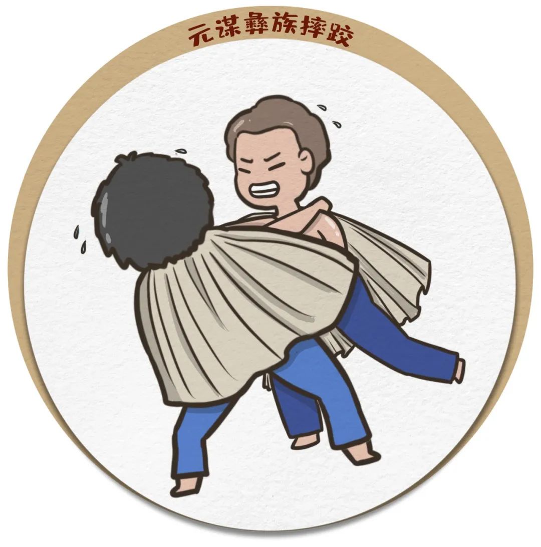 彝族式摔跤是为抗拒异族入侵,保卫家园而形成的,体现出了彝族人民力量和智慧的较量。