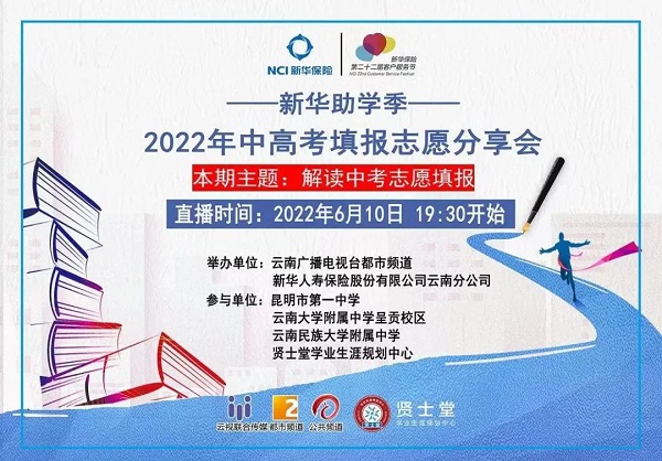 6月10日起,新华保险云南分公司将联合云南广播电视台都市频道开展中高考季系列公益活动——“新华保险第二十二届客户服务节中高考志愿填报会”,为考生和家长答疑解惑,干货满满,不容错过!
