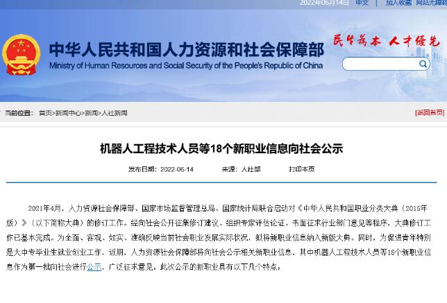 新华社北京6月14日电(姜琳、徐皓冰)人力资源和社会保障部14日向社会公示“民宿管家”“家庭教育指导师”“研学旅行指导师”“机器人工程技术人员”等18个新职业。经公示征求意见、修改完善后,这些新职业将被纳入新版职业分类大典。