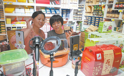 江西鹰潭市余江区大力推广网络购物、直播带货等消费模式,本地茄子干、红薯粉丝等绿色农产品搭上网络快车,走上百姓餐桌。图为余江区益农电商运营中心经理于小葵(左)在店里直播带货。 吴紫云摄