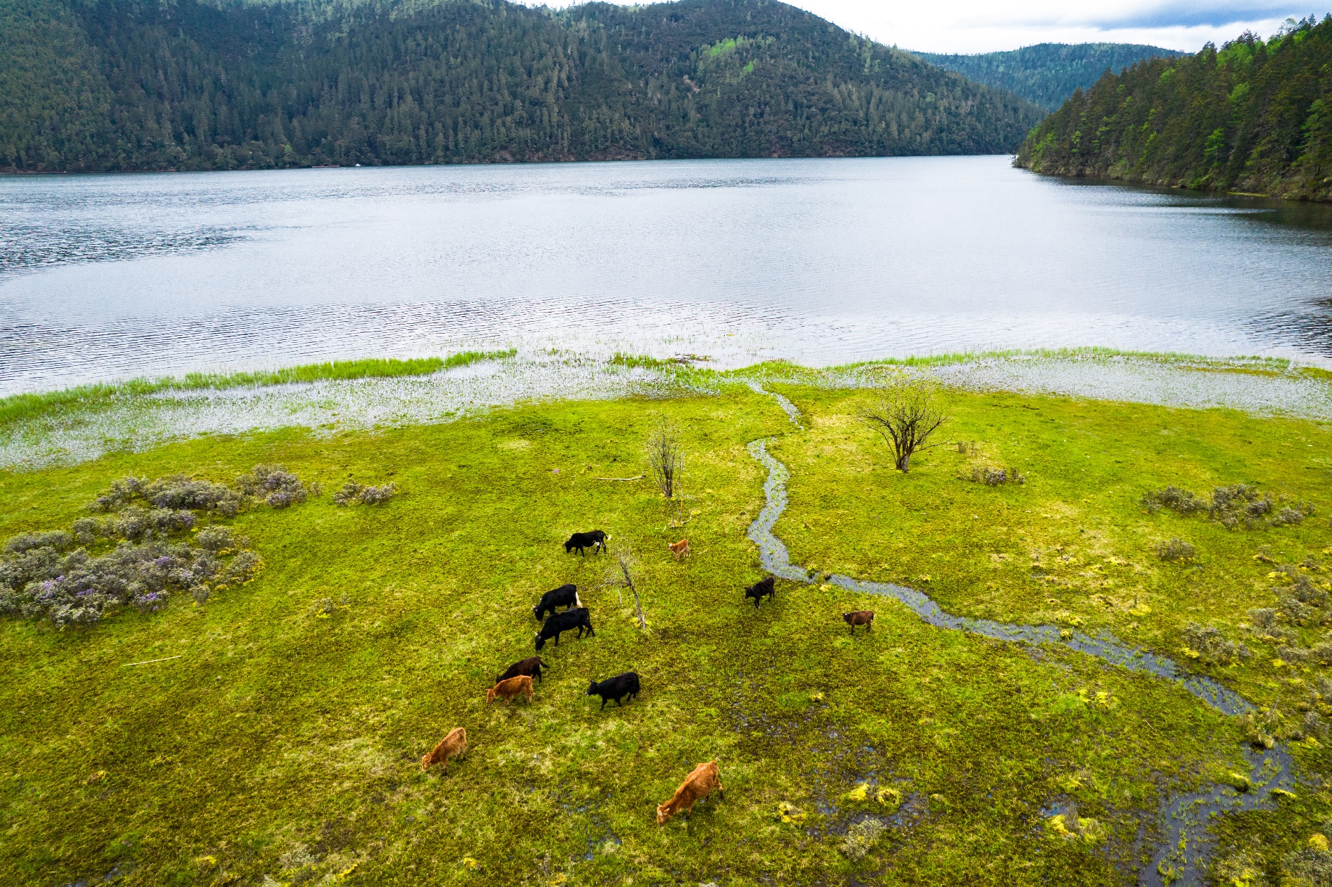 这里一年四季景色各异:春季,万物复苏,山坡上各色杜鹃花依次盛开;夏季,这里水草丰美,许多牦牛、马儿悠闲地在草地上觅食;秋季,水草由绿转黄,山坡上的树叶纷纷换上新衣,犹如打翻了调色板;冬季,各类候鸟纷至沓来,在湖面嬉戏、打闹……