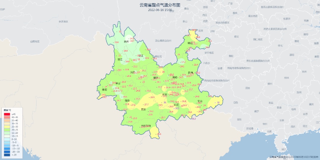 其中,滇西南局部地区出现雷电及短时强降水天气,最大小时雨量42.2毫米(6月15日15时,景洪市光明电站)。