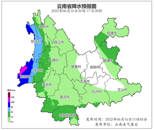 6月16日20时到6月17日20时:怒江、保山西部、德宏阴有大雨局部暴雨、大暴雨,迪庆西部、大理西部、保山东部、临沧西部、普洱南部、西双版纳、红河南部、昭通南部、曲靖东北部阴天间多云有小到中雨,其他地区多云局部有阵雨。
