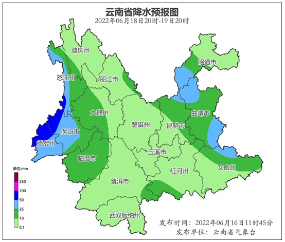 6月18日20时到6月19日20时:怒江西部、保山、德宏阴有大雨局部暴雨,怒江东部、大理西部、临沧、红河南部、昭通南部、曲靖、文山东部、昆明东北部、丽江东南部阴天间多云有小到中雨局部大雨,其他地区多云有阵雨局部中雨。