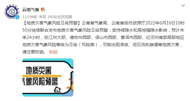 地质灾害方面,预计6月16日20:00~6月17日20:00,迪庆州西部、怒江州大部、德宏州大部、保山市西部、普洱市西部和东南部、西双版纳州中部、红河州南部地质灾害气象风险等级为Ⅲ级(风险较高),其中怒江州北部、德宏州中西部、保山市西部、普洱市西南部地区地质灾害气象风险等级为Ⅱ级(风险高)。