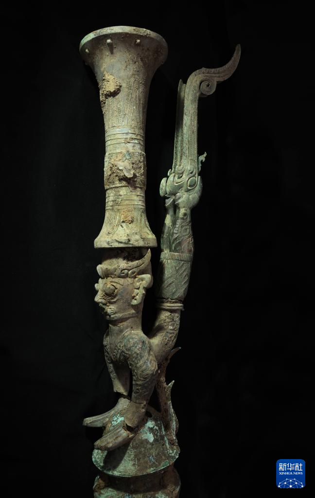 在四川省广汉市拍摄的三星堆遗址8号“祭祀坑”新发现的顶尊蛇身铜人像(6月1日摄)。