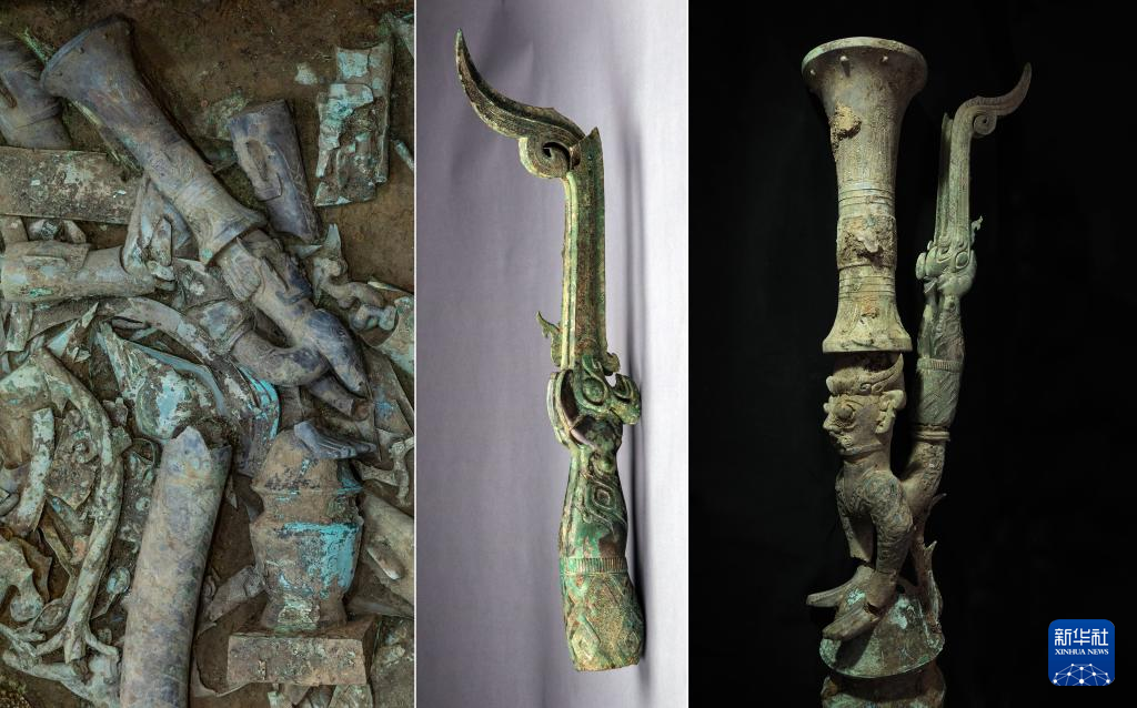 这是一张拼版照片:左为6月1日在四川省广汉市拍摄的三星堆遗址8号“祭祀坑”新发现的顶尊蛇身铜人像(新华社记者 沈伯韩 摄);中为6月15日拍摄的1986年2号“祭祀坑”出土的青铜鸟脚人像残部(三星堆博物馆供图);右为6月15日拍摄的拼对成功的鸟足曲身顶尊神像(鲁海子 摄)。