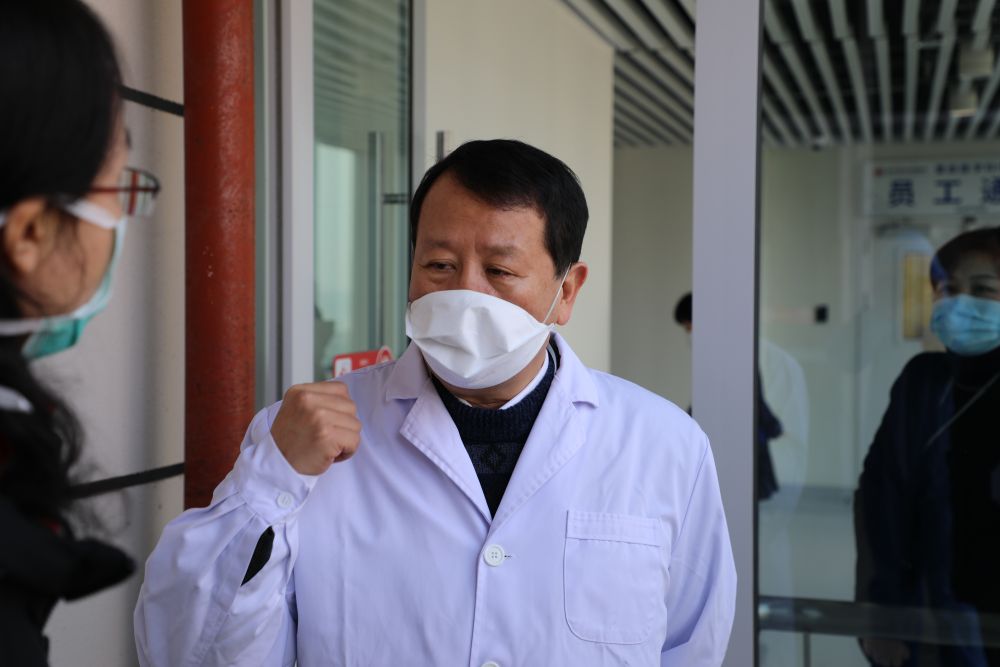 谢俊明在医院为抗疫医护人员打气(资料照片)。 新华社发