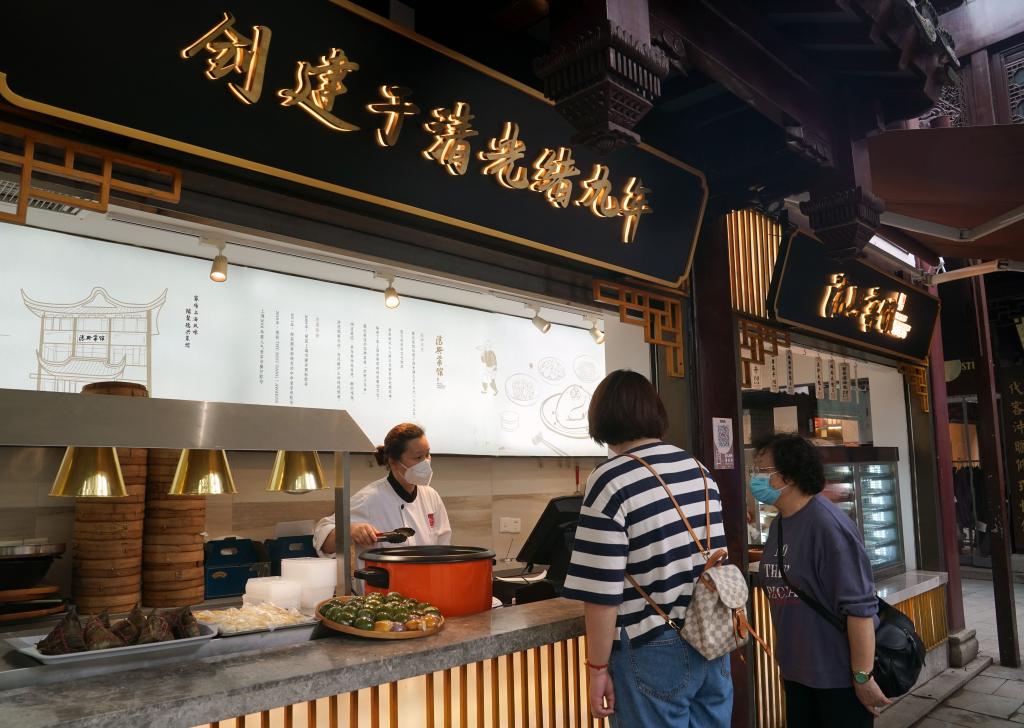 6月3日,上海市民在豫园老字号德兴菜馆的外带窗口购买粽子。(新华社记者刘颖 摄)