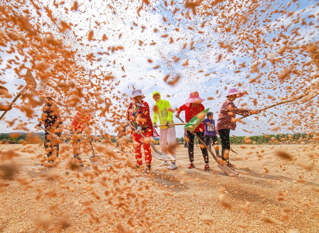6月13日,在山东省荣成市上庄镇大李家村晾晒场,村民们在晾晒小麦。(新华社发)