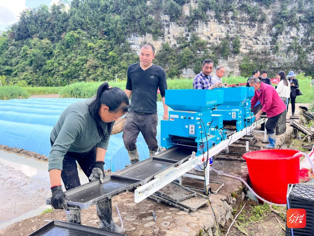 铲底土、递秧盘、加稻种、运叠秧盘……三月中旬,多彩贵州网记者在凤冈县新建镇新建社区水稻育苗现场看到,几名农户各司其职,围着正在运转的水稻播种流水线忙碌着,一派热火朝天的景象。
