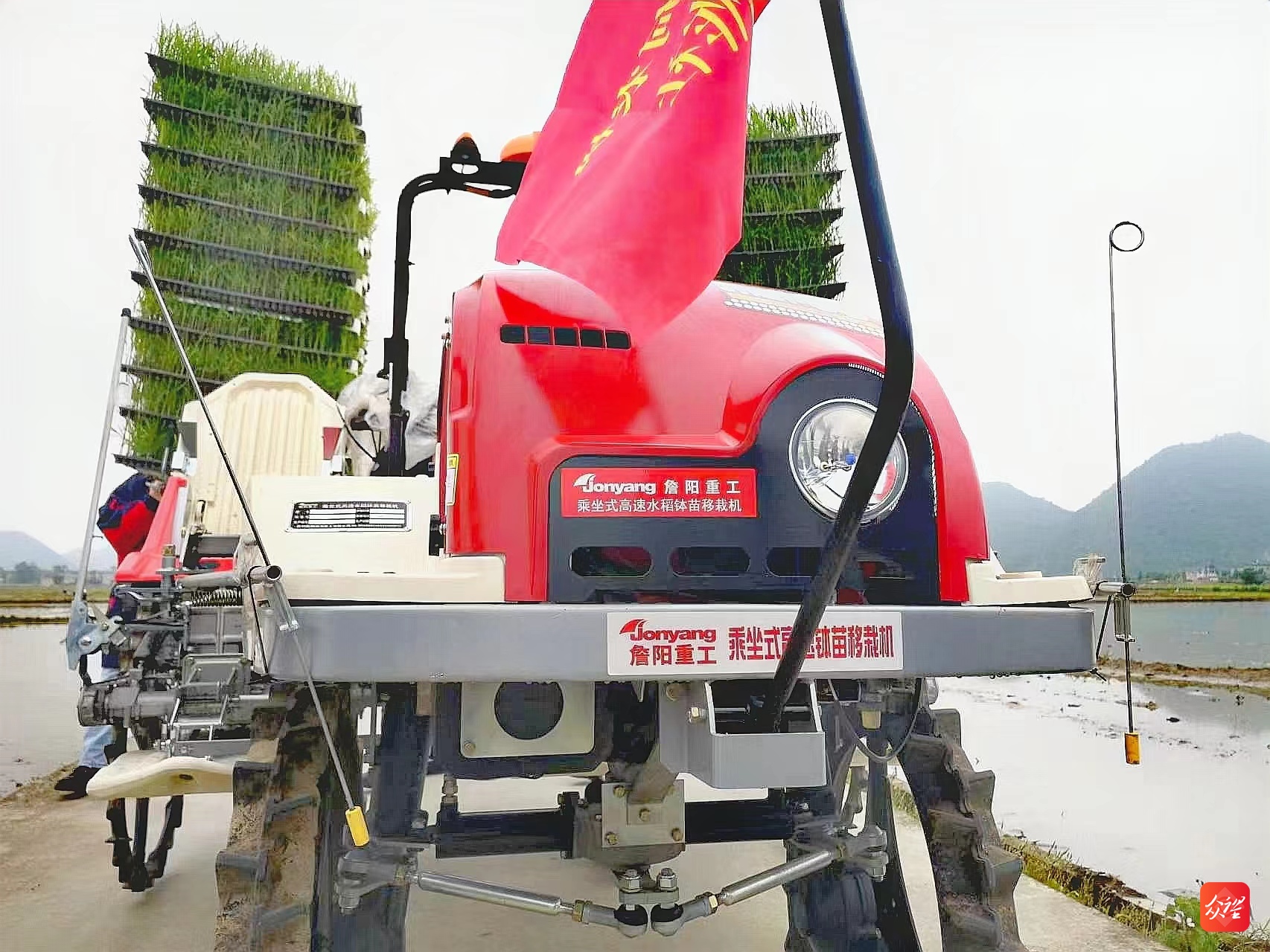“田里演示的乘坐式高速水稻钵苗移栽机,插秧效率快,只用把育好的秧苗盘放置在设备上,两个人在农机上配合操作,仅用10分钟左右就能完成1亩地的水稻插秧工作……”在现场,农机技术人员正演示着詹阳重工生产的乘坐式高速水稻钵苗移栽机的实际操作方法。