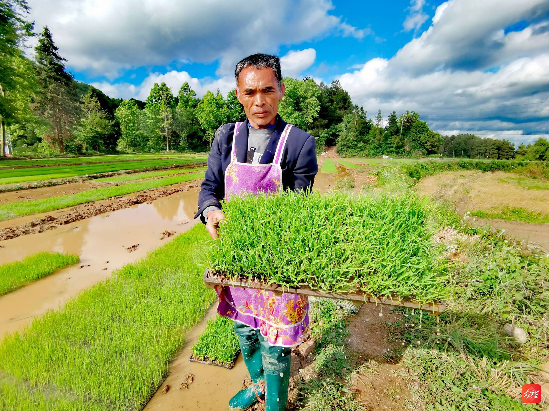 在修文县大木村的育秧基地里,一盘盘绿油油的秧苗好似一块块绿毯。当地农户左手提着一块钵体育秧盘,右手拇指轻轻一顶,秧苗便与育秧盘分离,盘底不见丝毫泥水。