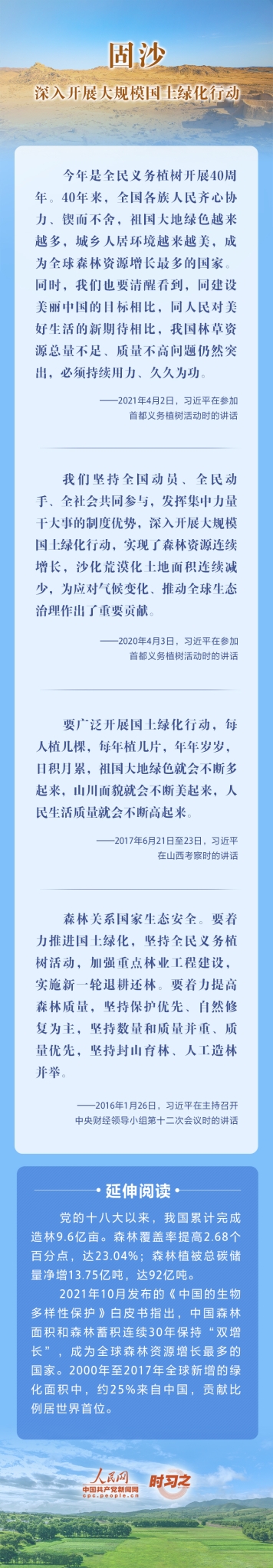 2022年6月17日是第二十八个世界防治荒漠化与干旱日。荒漠化是全球面临的重大生态问题,党的十八大以来,在习近平生态文明思想的指引下,我国荒漠化防治工作开辟了新境界、迈上了新台阶。让我们一起从总书记的重要论述里学习领悟中国践行绿色发展理念,坚定走好荒漠化防治之路的决心。