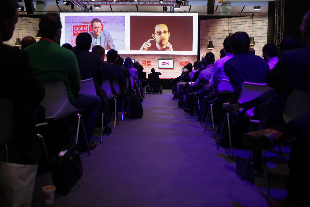 2015年3月18日,斯诺登在德国汉诺威通信和信息技术博览会上接受远程实时访问。新华社记者张帆 摄
