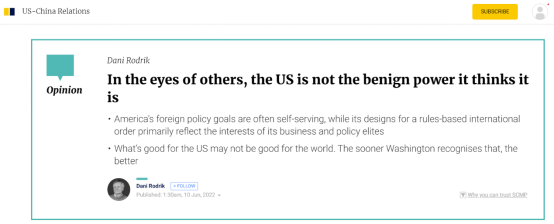6月10日,香港《南华早报》刊发哈佛大学肯尼迪政府学院国际政治经济学教授丹尼•罗德里克、题为“在别人眼里,美国并不是它所认为的那种善意的力量(In the eyes of others, the US is not the benign power it thinks it is)”的评论文章。文章称,美国外交政策的目标往往是自私的,其对“开放市场”和“基于规则的国际秩序”的设计,通常主要反映的是美国商业和政治精英的利益,而不是小国的愿望。