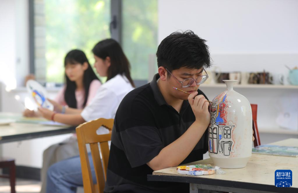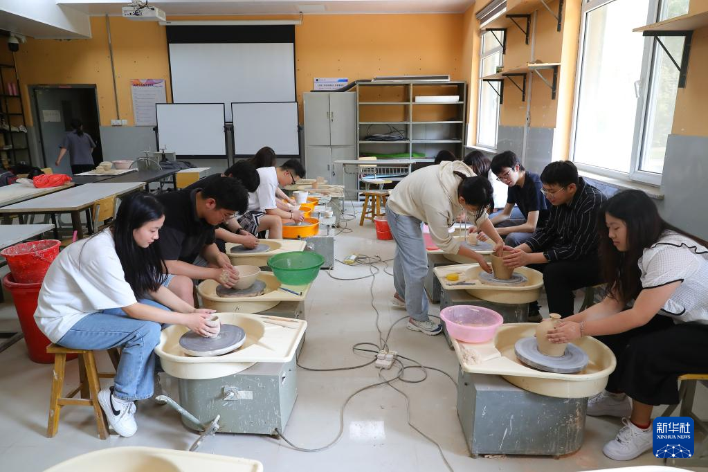 抚顺大官窑陶瓷制作技艺是抚顺市非物质文化遗产。6月16日,沈阳工学院部分艺术类专业和选修陶瓷制作课的学生,来到抚顺大官窑陶瓷工作室,在老师指导下体验陶瓷泥胚制作、陶瓷绘画等工艺,感受陶瓷制作魅力。(新华社 记者杨青 )