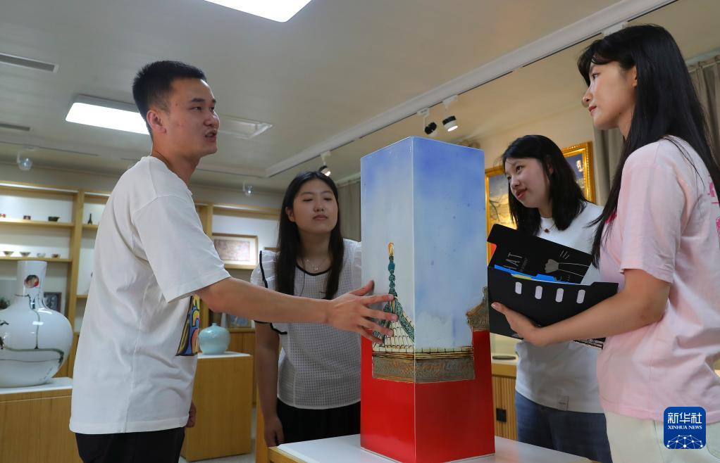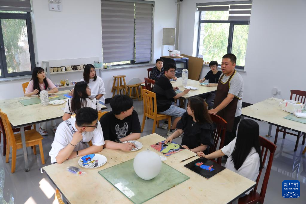 6月16日,在抚顺大官窑陶瓷工作室,老师(左一)给学生们讲解陶瓷艺术品制作过程。新华社记者 杨青 摄