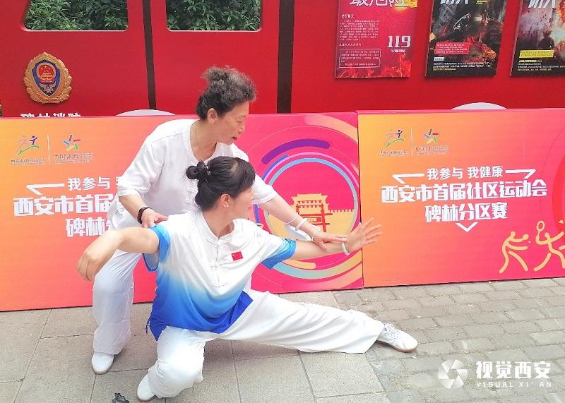 6月10日,社区运动会开幕式当天,碑林分赛区的多项赛事,已在设于长乐公园内的赛场上全面展开。在新编28式太极拳比赛的现场,48岁的张英正在利用上场前的最后一点宝贵时间,向长乐公园桂花园太极拳辅导站代表队的指导老师高福珍,请教着技术动作的要领以及让动作衔接更顺畅的诀窍。“我五年前来公园散步时看到有人在练太极拳,于是很快就加入了其中。这里的老师每天都免费给大家指导,我练得很开心,也认识了很多志同道合的伙伴,唯一的遗憾就是没有太多比赛和展示的机会,这下好了,有了社区运动会这样的舞台,我和伙伴们都很开心,大家订制了统一的练功服,也在赛前做了精心的准备,成绩如何不是最重要的,最重要的是能够参与到这样的全民健身赛事中,与更多热爱传统武术和太极拳的其他队伍交流切磋,大家通过比赛,可以共同提高。”