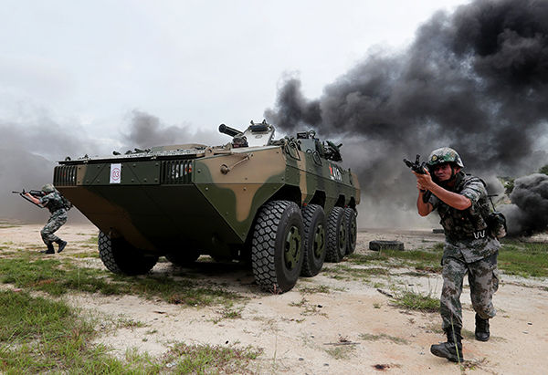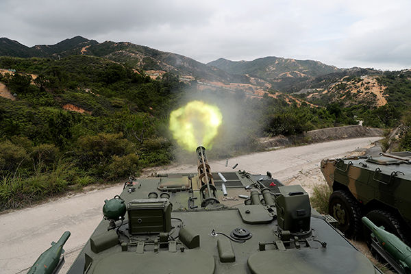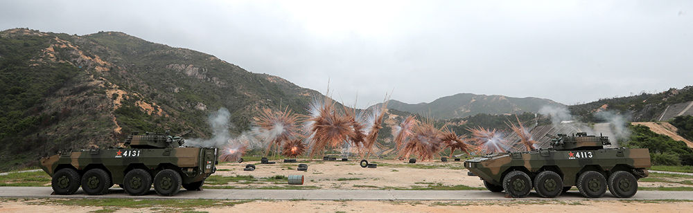↑驻香港部队某旅装步一连组织人车协同训练(5月24日摄)。新华社发(易定 摄)