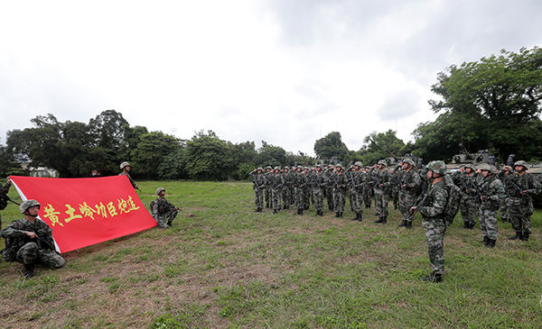 ↑驻香港部队某旅装步一连官兵拉练归来(5月8日摄)。新华社发(易定 摄)