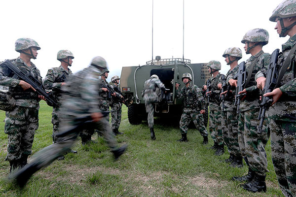 ↑驻香港部队某旅装步一连进行载员上下车课目训练(5月10日摄)。新华社发(陈杰 摄)