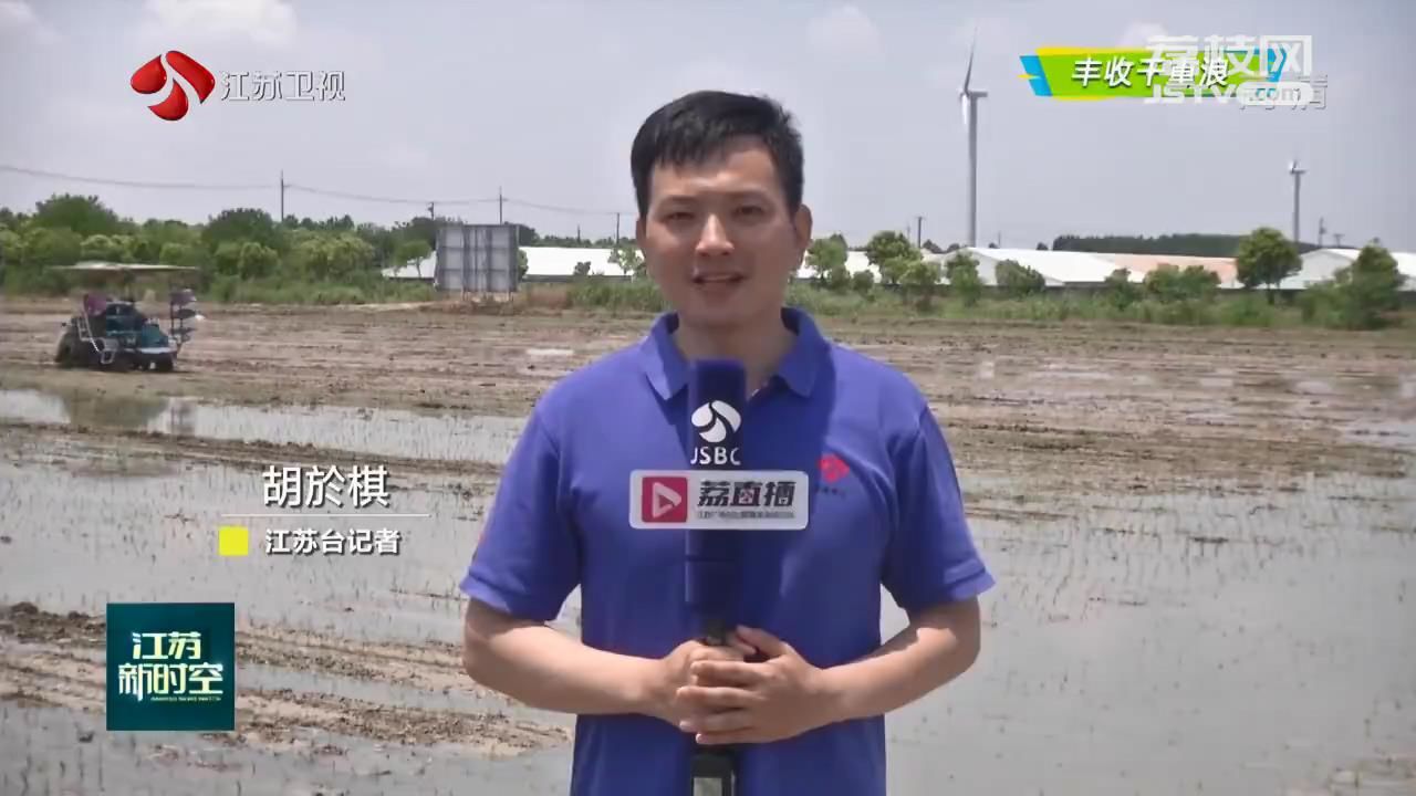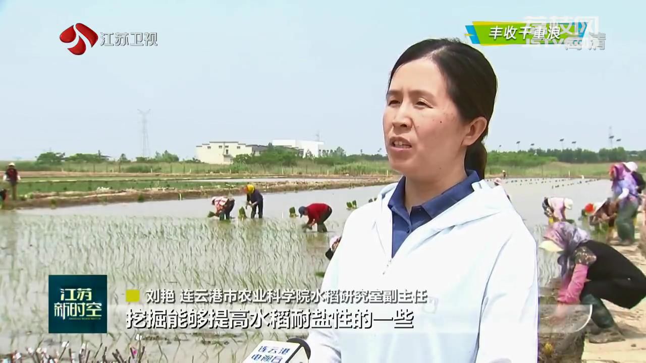 江苏台记者胡於棋说:“我现在所在的地方是南通市如东县栟茶镇方凌垦区耐盐水稻示范种植基地。刚收完了小麦和油菜,村民们又忙着夏种。他们正在将耐盐水稻秧苗移载到我身旁稻田里。”