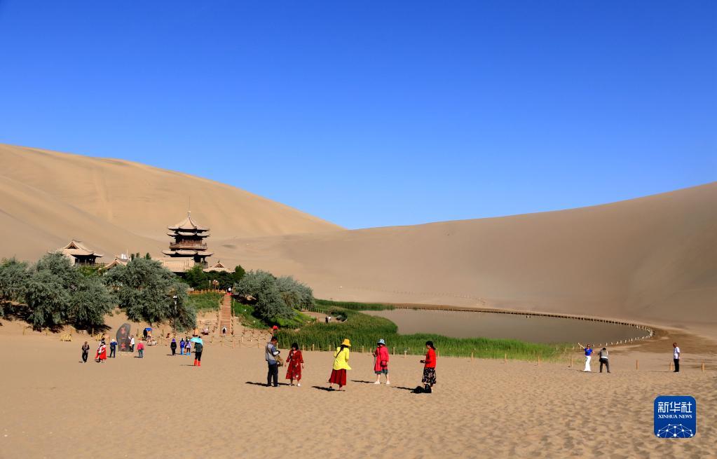 6月19日,游客在甘肃省敦煌市鸣沙山月牙泉景区游览。