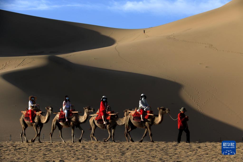 6月19日,游客在甘肃省敦煌市鸣沙山月牙泉景区骑骆驼游览。