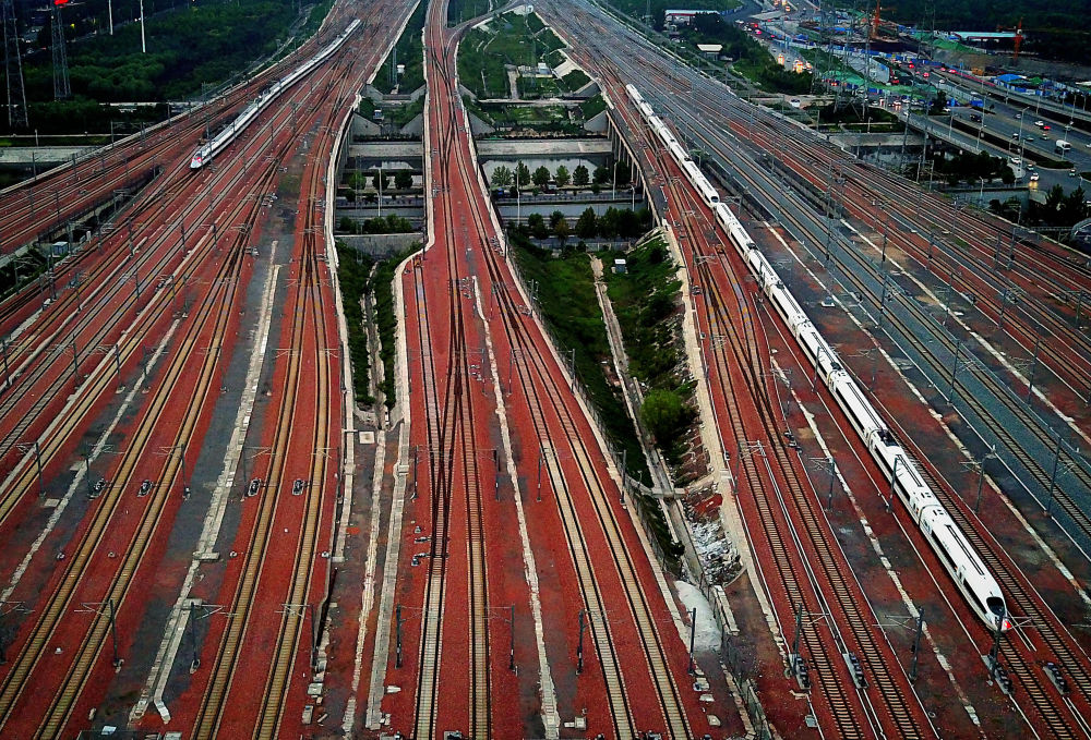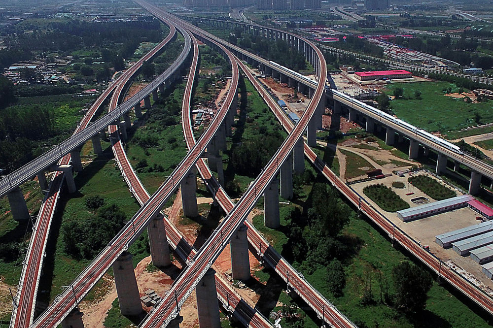 ↑这是郑州东站附近一处京广、徐兰高铁交汇的立体枢纽(2016年9月1日摄)。新华社记者 李安 摄